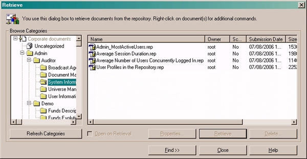 The retrieve reports screen to